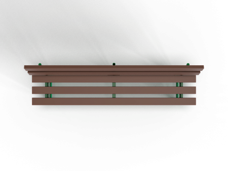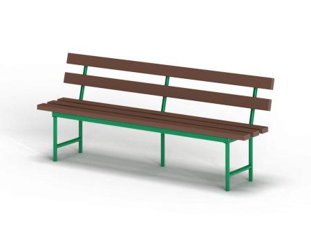 Лавочка со спинкой изготовлена из сборного металлического каркаса и бруса из древесно-полимерного композита (ДПК).
