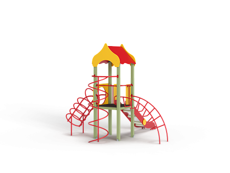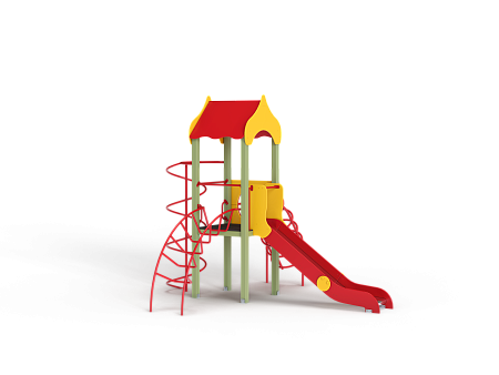 Детский игровой комплекс состоит из башни с крышей, горкой, спиралью наклонной, ограждения с лазом, лианы наклонной, шестом спиралью, перекладинами и ручек вспомогательных.
