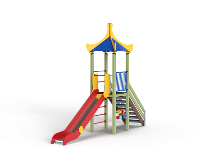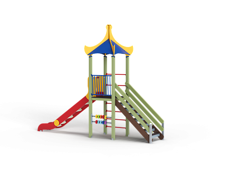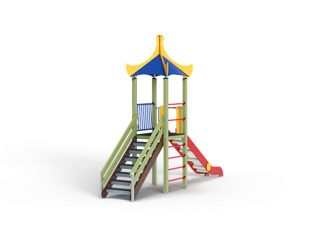 Детский игровой комплекс состоит из одной башни с крышей, лестницей, горкой, перекладинами, ограждением и детскими счётами.