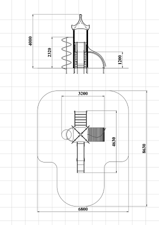 Детский игровой комплекс состоит из одной башни с крышей, лестницей, горкой, трапом-барабаном с перекладиной и канатом, ручками и шестом-спиралью.