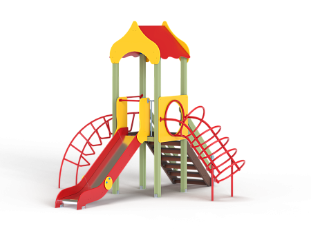 Детский игровой комплекс состоит из одной башни с крышей, лестницей, горкой, лианой и спиралью наклонной.