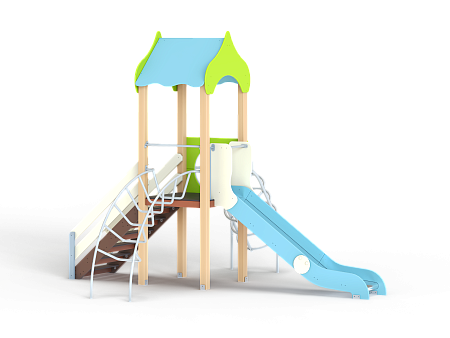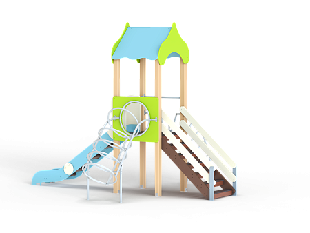 Детский игровой комплекс состоит из одной башни с крышей, лестницей, горкой, лианой и спиралью наклонной.