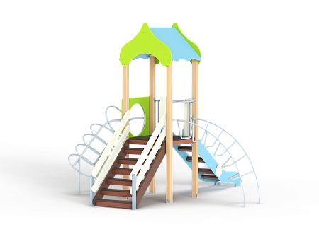 Детский игровой комплекс состоит из одной баш-ни с крышей, лестницей, горкой, лианой, спира-лью наклонной. Все резьбовые соединения долж-ны быть закрыты разноцветными пластиковыми заглушками.