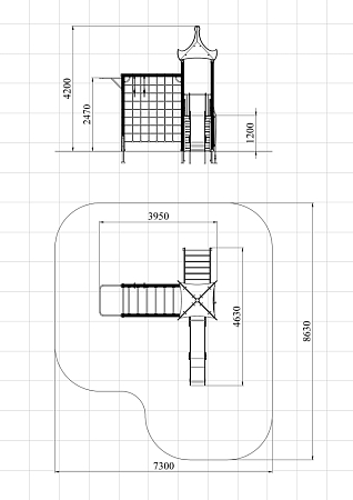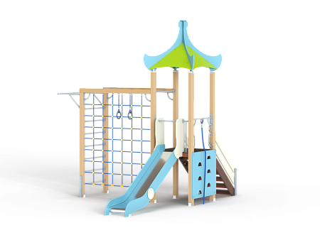 Детский игровой комплекс состоит из одной башни с продолжением в виде гимнастического комплекса. На башне установлена крыша, лестница, горка, альпинистская стенка с перекладиной и канатом. Гимнастический комплекс состоит из рукохода, шведской стенки, турника, гимнастических колец и полипропиленовой сетки.