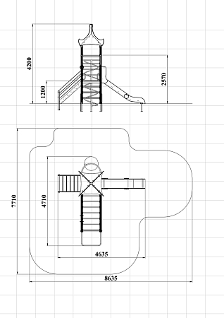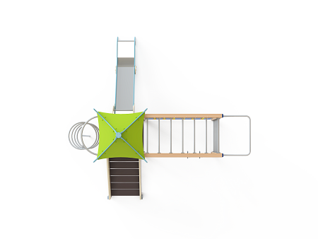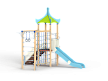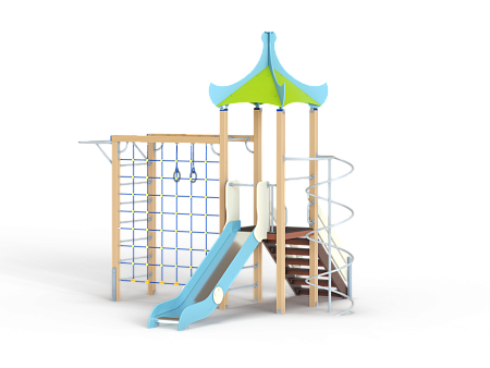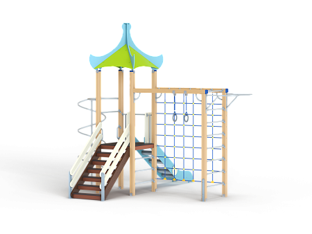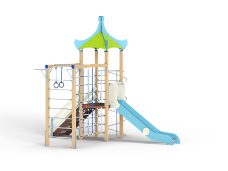 Детский игровой комплекс состоит из одной башни с продолжением в виде гимнастического комплекса. На башне установлена крыша, лестница, горка, шест-спираль, шведская стенка и ручки. Гимнастический комплекс состоит из рукохода, шведской стенки, турника, гимнастических колец и полипропиленовой сетки.