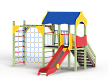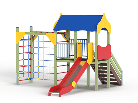 Детский игровой комплекс состоит из башни с крышей, шведской стенкой, ограждениями фанерным и металлическим , огражддением из бруса с перекладинами, горкой и лестницей. К башне присоединен гимнастический комплекс с рукоходом, полипропиленовой сеткой и шведской стенкой.