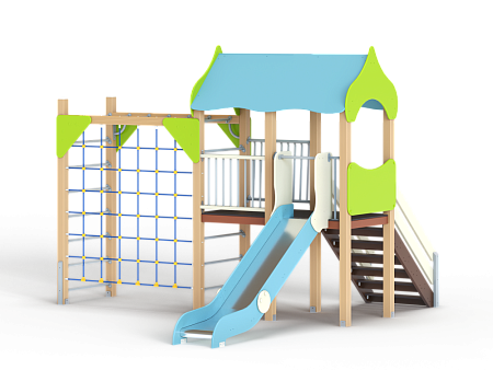 Детский игровой комплекс состоит из башни с крышей, шведской стенкой, ограждениями фанерным и металлическим , огражддением из бруса с перекладинами, горкой и лестницей. К башне присоединен гимнастический комплекс с рукоходом, полипропиленовой сеткой и шведской стенкой.