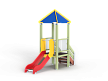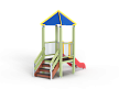 Детский игровой комплекс состоит из башни с фанерной крышей, горкой, ограждениями из бруса с перекладинами, лестницей.