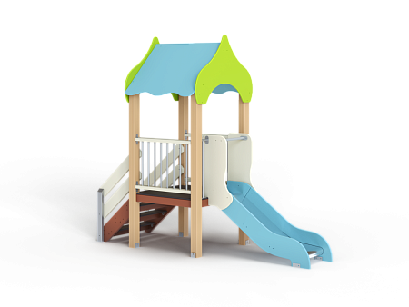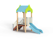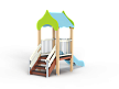 Детский игровой комплекс состоит из одной башни с крышей, лестницей, горкой, ограждениями из бруса с перекладинами.