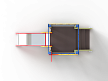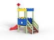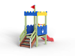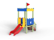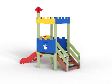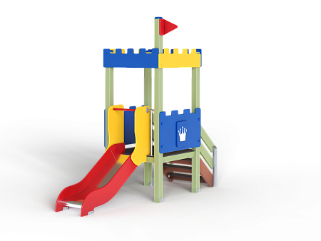 Детский игровой комплекс состоит из башни с фанерной крышей, горкой, фанерными ограждениями, лестницей и декоративными флажками над крышей.