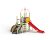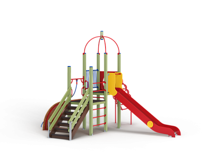 Детский игровой комплекс состоит из двух разновысоких башен. На одной из башен установлена металлическая крыша, спираль наклонная, горка, металлическое ограждение, на другой башне установлен трап барабан с перекладиной и канатом, шведская стенка, ручки и лестница.