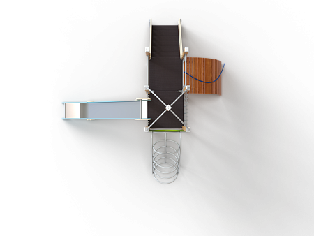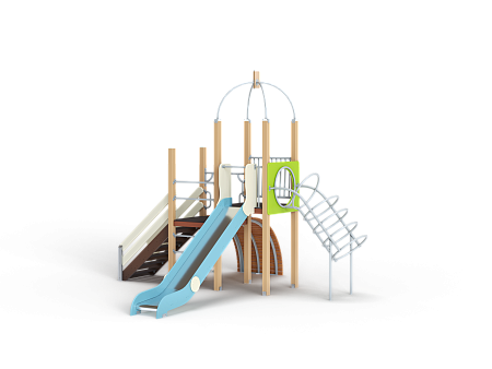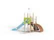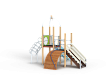 Детский игровой комплекс состоит из двух разновысоких башен. На одной из башен установлена металлическая крыша, спираль наклонная, горка, металлическое ограждение, на другой башне установлен трап барабан с перекладиной и канатом, шведская стенка, ручки и лестница.