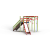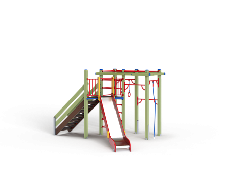Детский игровой комплекс состоит из треугольной башни и гимнастического комплекса. На башне установлена лестница, горка, металлическое ограждение и шведская стенка. На гимнастическом ком-плексе установлены перекладины, перекладины усиленные, перекладина с канатом, перекладина с кольцами, шведская стенка и сетка полипропиленовая.