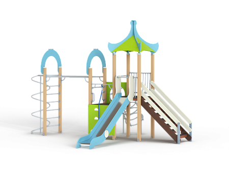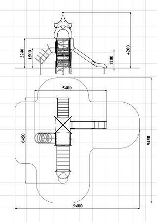 Детский игровой комплекс состоит из двух разновысоких башен. На одной из башен установлены крыша, лестница, горка, металлическое ограждение, на другой башне установлены альпинистская стенка, перекладина с канатом, ручки, спираль наклонная, ограждение с лазом. Одна из башен имеет продолжение в виде гимнастического комплекса который состоит из рукохода, шведской стенки, шеста-спирали и двух фанерных арок.