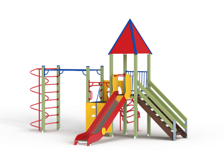Детский игровой комплекс состоит из двух разновысоких башен. На одной из башен установлены крыша в форме пирамиды, лестница, горка, металлическое ограждение, на другой башне установлены альпинистская стенка, перекладина с канатом, спираль наклонная, ограждение с лазом. Одна из башен имеет продолжение в виде гимнастического комплекса,который состоит из рукохода, шведской стенки и шеста-спирали.