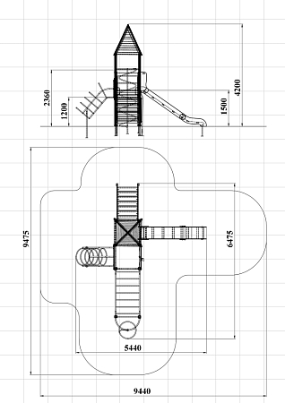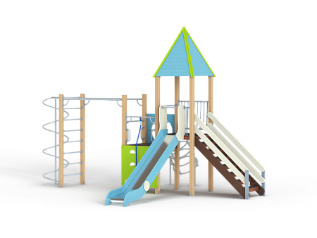 Детский игровой комплекс состоит из двух разновысоких башен. На одной из башен установлены крыша в форме пирамиды, лестница, горка, металлическое ограждение, на другой башне установлены альпинистская стенка, перекладина с канатом, спираль наклонная, ограждение с лазом. Одна из башен имеет продолжение в виде гимнастического комплекса,который состоит из рукохода, шведской стенки и шеста-спирали.