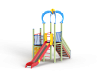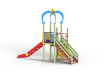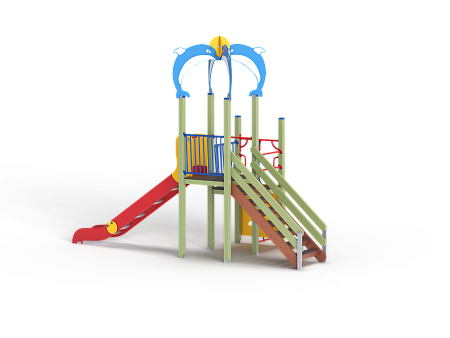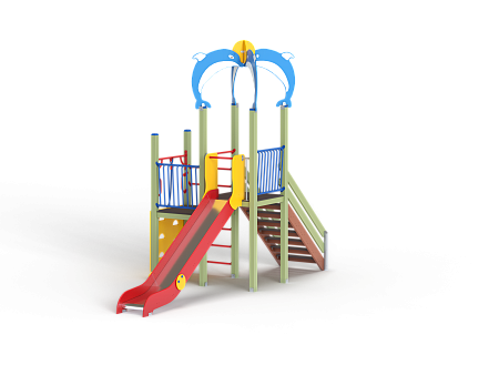 Детский игровой комплекс состоит из двух разновысоких башен. На одной из башен установлены крыша в форме дельфинов, лестница, горка, металлическое ограждение, на другой башне установлены альпинистская стенка, перекладина с канатом, металлическое ограждение, ручки и шведская стенка.