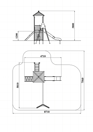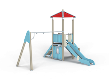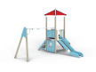 Детский игровой комплекс состоит из башни с качелями. На башне установлены крыша четырехскатная, пять ограждений из бруса, трап из бруса с альпинистскими камнями, лестница, горка и примыкающие к ней качели на деревянных столбах.