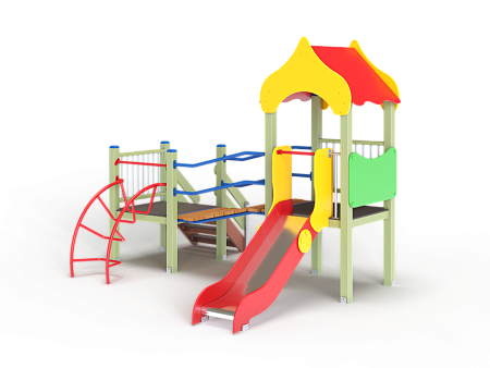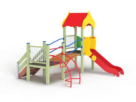 Детский игровой комплекс состоит из двух башен соединенных разновысоким мостом с металлическими перилами. На первой башне установлена крыша, фанерное ограждение, ограждение из бруса с перекладинами и горка. На второй башне установлена лестница, ограждение из бруса с перекладинами и лиана наклонная с перекладиной.