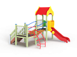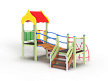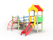 Детский игровой комплекс состоит из двух башен соединенных разновысоким мостом с металлическими перилами. На первой башне установлена крыша, фанерное ограждение, ограждение из бруса с перекладинами и горка. На второй башне установлена лестница, ограждение из бруса с перекладинами и лиана наклонная с перекладиной.
