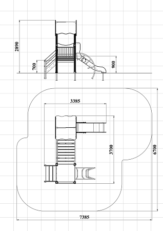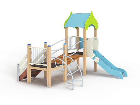Детский игровой комплекс состоит из двух башен соединенных разновысоким мостом с металлическими перилами. На первой башне установлена крыша, фанерное ограждение, ограждение из бруса с перекладинами и горка. На второй башне установлена лестница, ограждение из бруса с перекладинами и лиана наклонная с перекладиной.