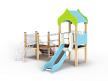Детский игровой комплекс состоит из двух башен соединенных разновысоким мостом с металлическими перилами. На первой башне установлена крыша, фанерное ограждение, ограждение из бруса с перекладинами и горка. На второй башне установлена лестница, ограждение из бруса с перекладинами и лиана наклонная с перекладиной.