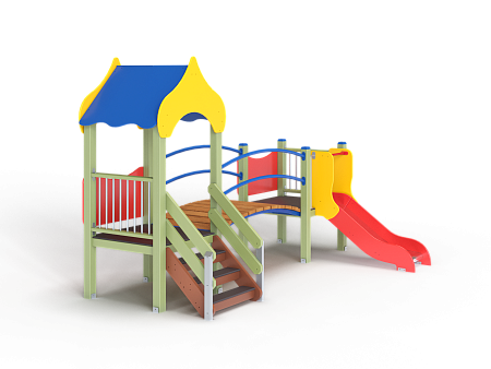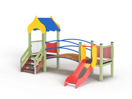Детский игровой комплекс состоит из двух башен соединенных радиусным мостом с металлическими перилами. На первой башне установлена крыша,фанерное ограждение, ограждение из бруса с перекладинами и лестница. На второй башне установлена горка, фанерное ограждение и ограждение из бруса с перекладинами.