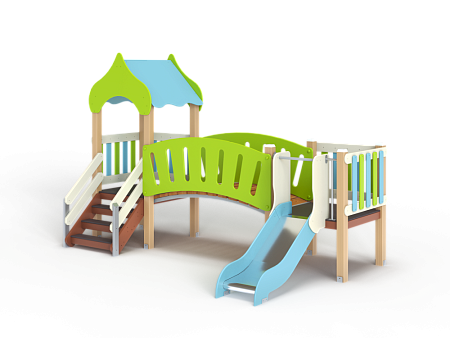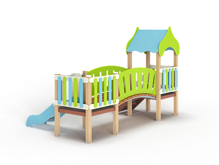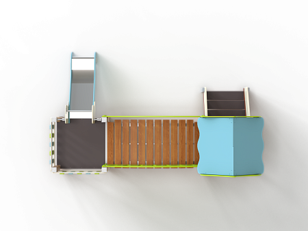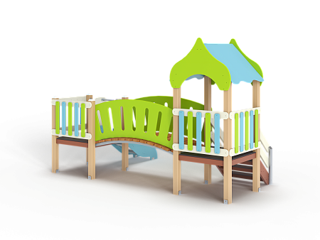 Детский игровой комплекс состоит из двух башен соединенных радиусным мостом с фанерными перилами. На первой башне установлена крыша, два фанерных ограждения из балясин и лестница. На второй башне установлена горка и два ограждения фанерных из балясин.