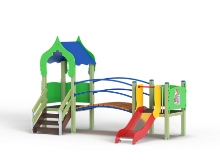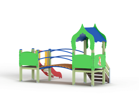 Детский игровой комплекс состоит из двух башен соединенных радиусным мостом с металлическими перилами. На первой башне установлена крыша, два фанерных ограждения с художественно оформленной поверхностью и лестница. На второй башне установлена горка и два ограждения фанерных с художественно оформленной поверхностью.