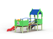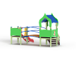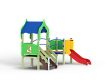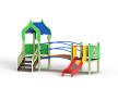 Детский игровой комплекс состоит из двух башен соединенных радиусным мостом с металлическими перилами. На первой башне установлена крыша, два фанерных ограждения с художественно оформленной поверхностью и лестница. На второй башне установлена горка и два ограждения фанерных с художественно оформленной поверхностью.