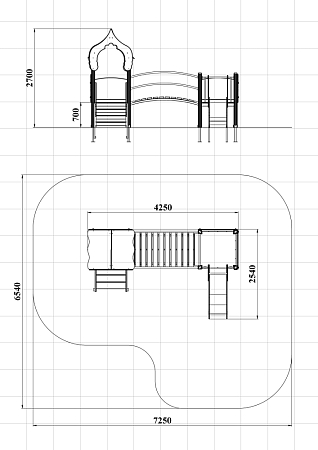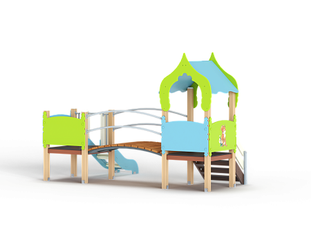 Детский игровой комплекс состоит из двух башен соединенных радиусным мостом с металлическими перилами. На первой башне установлена крыша, два фанерных ограждения с художественно оформленной поверхностью и лестница. На второй башне установлена горка и два ограждения фанерных с художественно оформленной поверхностью.