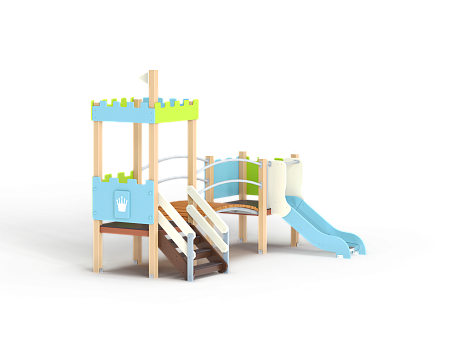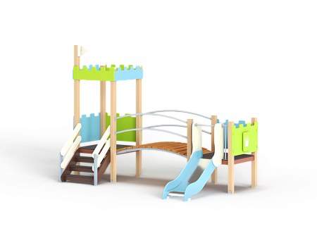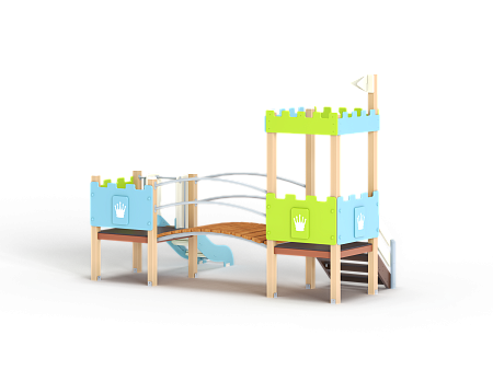 Детский игровой комплекс состоит из двух башен соединенных радиусным мостом с металлическими перилами. На первой башне установлена крыша, декоративные флажки, два фанерных ограждения и лестница. На второй башне установлена горка и два ограждения фанерных.