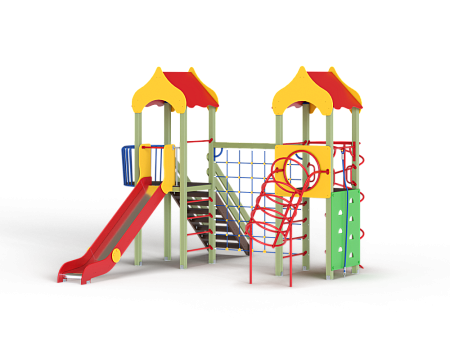 Детский игровой комплекс состоит из двух башен крышами. На одной из башен установлена лестница, горка, балкон, шведская стенка. На другой башне установлены альпинистская стенка, перекладина с канатом, шест спираль, шведская стенка, фанерное ограждение и ручки вспомогательные. Башни соединены полипропиленовой сеткой и столбом. Все резьбовые соединения должны быть закрыты разноцветными пластиковыми заглушками.
