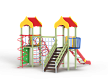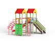 Детский игровой комплекс состоит из двух башен крышами. На одной из башен установлена лестница, горка, балкон, шведская стенка. На другой башне установлены альпинистская стенка, перекладина с канатом, шест спираль, шведская стенка, фанерное ограждение и ручки вспомогательные. Башни соединены полипропиленовой сеткой и столбом. Все резьбовые соединения должны быть закрыты разноцветными пластиковыми заглушками.