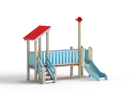 Детский игровой комплекс состоит из двух башен соединенных прямым мостом с перилами, выполненными из бруса. На первой башне установлены лестница, крыша и два ограждения из бруса. На второй башне установлены горка, декоративные флажки и два ограждения из бруса.