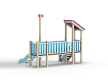 Детский игровой комплекс состоит из двух башен соединенных прямым мостом с перилами, выполненными из бруса. На первой башне установлены лестница, крыша и два ограждения из бруса. На второй башне установлены горка, декоративные флажки и два ограждения из бруса.