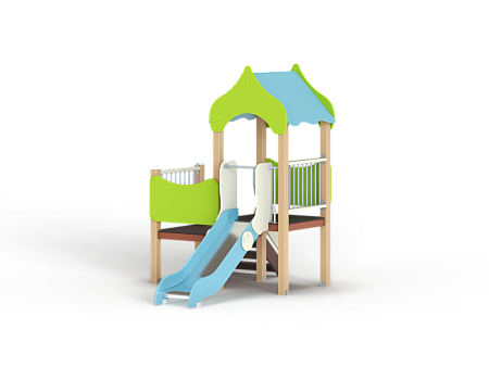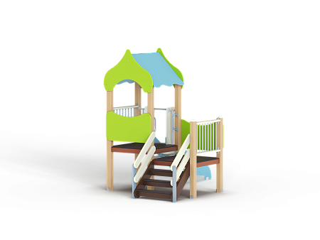 Детский игровой комплекс состоит из двух разновысоких башен. На одной башне установлены фанерная крыша, горка, вспомогательные ручки, фанерное ограждение и ограждение из бруса с перекладинами. На второй башне установлена лестница, фанерное ограждение и ограждение из бруса с перекладинами.