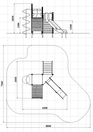 Детский игровой комплекс состоит из двух разновысоких башен. На одной из башен установлена лестница, горка, металлическое ограждение, на другой башне установлены трап барабан с перекладиной и канатом, шест спираль, две шведские стенки и ручки вспомогательные.