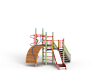 Детский игровой комплекс состоит из двух разновысоких башен. На одной из башен установлена лестница, горка, металлическое ограждение, на другой башне установлены трап барабан с перекладиной и канатом, шест спираль, две шведские стенки и ручки вспомогательные.