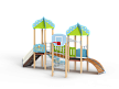 Детский игровой комплекс состоит из двух башен с крышами. На первой башне установлена лестни-ца, горка и фанерное ограждение. На второй башне установлены трап барабан с перекладиной и канатом и фанерное ограждение. Башни соеди-нены между собой разновысоким мостом, с одной стороны которого установлено фанерное огражде-ние, а с другой стороны сетка металлическая. Вто-рая башня имеет продолжение в виде вынесенной шведской стенки с баскетбольным щитом, соеди-няются металлическим рукоходом