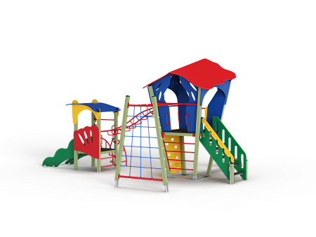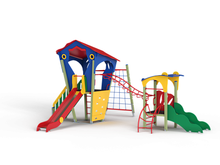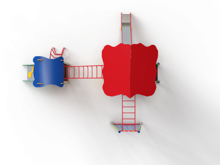 Детский игровой комплекс состоит из двух башен. На одной из башен установлена лестница, горка, альпинистская стенка, ограждение, ручки вспомогательные и внешняя сетка полипропиленовая, соединенная с башней рукоходом. На другой башне установлены трап, лиана, шведская стенка, ручки вспомогательные и ограждение. Башни соединены между собой металлическим рукоходом.