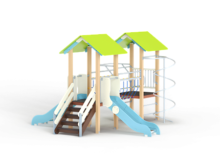 Детский игровой комплекс состоит из двух башен. На одной из башен установлена лестница, две горки и крыша, на другой башне установлены турник, шест спираль, шведская стенка, ручки вспомогательные и ограждение из бруса с перекладинами Башни соединены между собой канатным мостом.