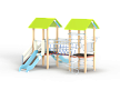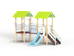 Детский игровой комплекс состоит из двух башен. На одной из башен установлена лестница, две горки и крыша, на другой башне установлены турник, шест спираль, шведская стенка, ручки вспомогательные и ограждение из бруса с перекладинами Башни соединены между собой канатным мостом.