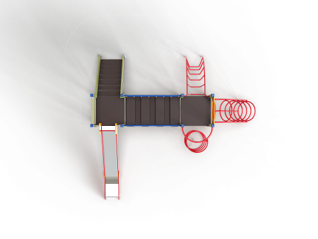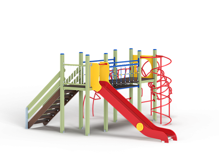 Детский игровой комплекс состоит из двух башен. На первой башне установлена лестница, горка и ограждение из бруса с перекладинами. Первая башня соединяется со второй башней подвесным мостом. На второй башне установлено ограждение с круглым вырезом, спираль наклонная, лиана и шест-спираль.