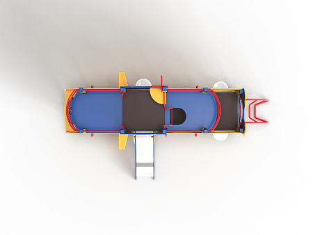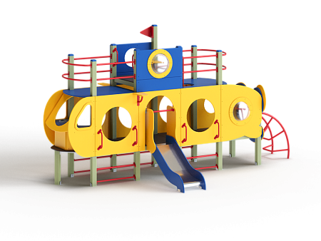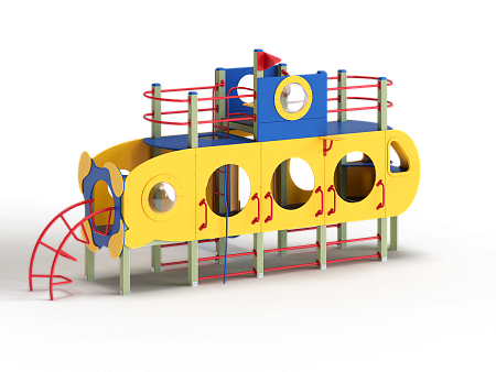 Детский игровой комплекс скомпонован в форме подводной лодки, состоит из четырех спаренных башен и одной радиусной полубашни, являющейся передом подводной лодки. Центральная башня - двухъярусная, имитирует рубку подводной лодки. Ограждениями первого яруса являются фанерные листы с круглыми вырезами-лазами. На задней части первого яруса два ограждения с пластиковыми иллюминаторами. На первом ярусе центральной башни расположена горка, напротив неё - ограждение с лазом и перекладина с канатом. Входами на первый ярус со стороны улицы являются шведские стенки, расположенные под боковыми ограждениями с лазами. К задней части подводной лодки крепится лиана наклонная. Переход с первого яруса на второй обеспечен лестницей металлической, крепящейся снизу к полу первого яруса, проходящей сквозь люк-вырез пола второго яруса, сверху крепится к столбам башни. Второй ярус огражден фанерными ограждениями с пластиковыми иллюминаторами и дуговыми металлическими перекладинами.