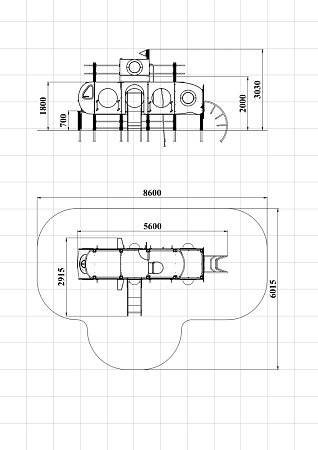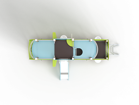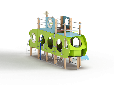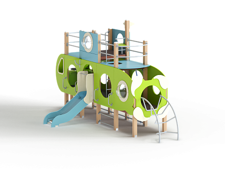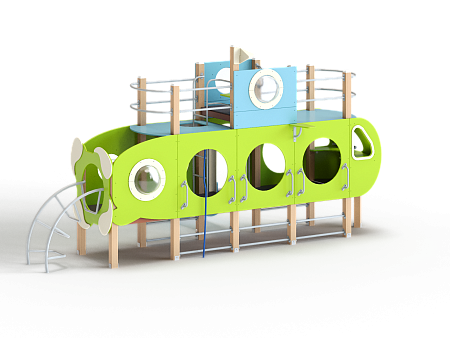 Детский игровой комплекс скомпонован в форме подводной лодки, состоит из четырех спаренных башен и одной радиусной полубашни, являющейся передом подводной лодки. Центральная башня - двухъярусная, имитирует рубку подводной лодки. Ограждениями первого яруса являются фанерные листы с круглыми вырезами-лазами. На задней части первого яруса два ограждения с пластиковыми иллюминаторами. На первом ярусе центральной башни расположена горка, напротив неё - ограждение с лазом и перекладина с канатом. Входами на первый ярус со стороны улицы являются шведские стенки, расположенные под боковыми ограждениями с лазами. К задней части подводной лодки крепится лиана наклонная. Переход с первого яруса на второй обеспечен лестницей металлической, крепящейся снизу к полу первого яруса, проходящей сквозь люк-вырез пола второго яруса, сверху крепится к столбам башни. Второй ярус огражден фанерными ограждениями с пластиковыми иллюминаторами и дуговыми металлическими перекладинами.
