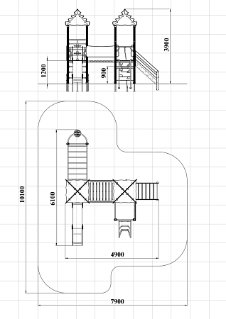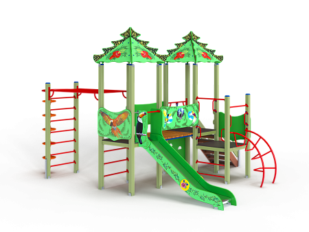 Детский игровой комплекс художественным оформлением в стиле “Райских птиц”. Комплекс состоит из двух башен с вынесенной шведской стенкой. На первой башне установлена крыша, альпинистская стенка с перекладиной и канатом, лестница, и примыкающая к нему полубашня с шведской стенкой, лианой, ручками вспомогательными и ограждением фанерным. На второй башне установлена горка, крыша, ручки вспомогательные, шведская стенка и примыкающий к ней рукоход с вынесенной шведской стенкой и шестом с пластиковыми кольцами. Башни соединены прямым мостом с фанерными перилами.