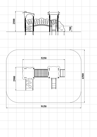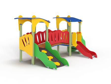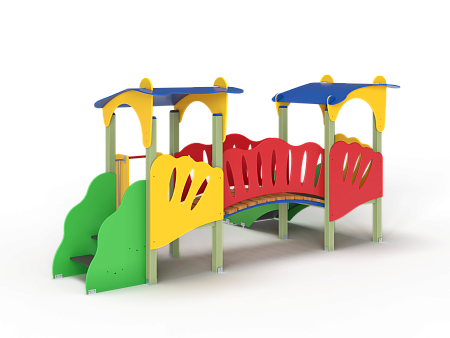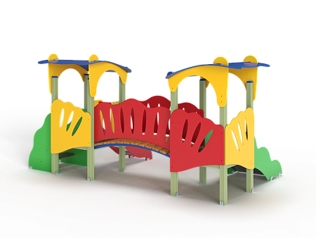 Детский игровой комплекс состоит из двух башен с фасонными крышами, соединенных радиусным мостом с фанерными перилами. На первой башне установлены лестница, горка и ограждение. На второй башне установлены трап и ограждения.