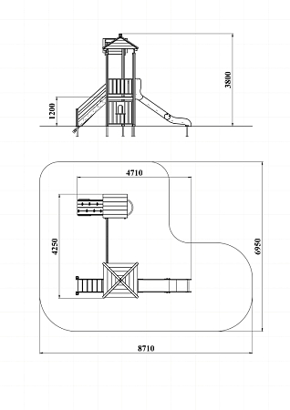 Детский игровой комплекс состоит из двух башен с качелями. На первой башне установлены крыша наклонная, ограждение из бруса, шест, перекладина и трап из бруса с альпинистскими камнями. На второй башне установлены горка, лестница, крыша четырехскатная, четыре ограждения из бруса и примыкающие к ней качели на деревянных столбах. Башни соединены полипропиленовой сеткой.