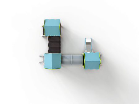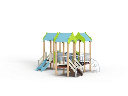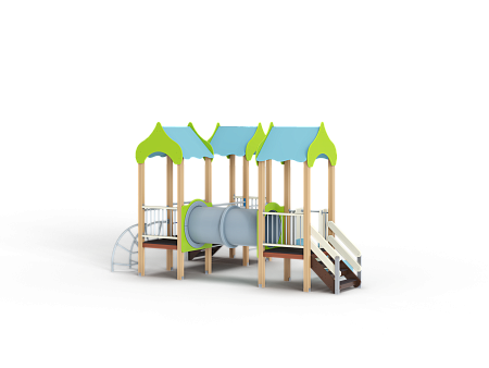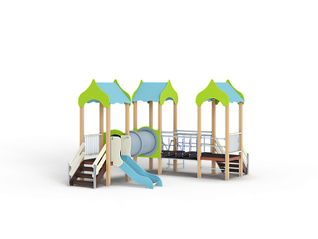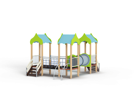 Детский игровой комплекс состоит из трёх башен. На первой башне установлена лестница и ограждение из бруса с перекладинами. На второй башне установлена горка и ограждение из бруса с перекладинами. На третьей башне установлена горка, лестница и ограждение из бруса с перекладинами. Третья и вторая башни соединены пластиковой трубой переходом, вторая и первая соединены подвесным мостом.